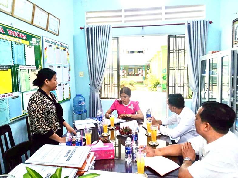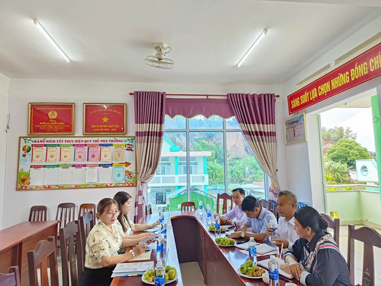 ( Ảnh: Đoàn khảo sát chụp ảnh lưu niệm với giáo viên và nhóm trẻ trường Mầm non Thanh Sơn) Đoàn đã đi khảo sát thực tế cơ sở vật chất, thiết bị đồ dùng dạy học, thăm hỏi các thầy cô giáo, các em học sinh và nghe đại diện BGH các trường báo cáo công tác triển khai nhiệm vụ năm học mới. Theo đó, đến thời điểm này, các trường đã ổn định công tác tổ chức và đi vào giảng dạy. Tổng số học sinh của trường THCS Trường Chinh là 431/10 lớp( trong đó: Khối 6 gồm 03 lớp/129 học sinh; Khối 7 gồm 03 lớp/129 học sinh; Khối 8gồm 02 lớp/86 học sinh; Khối 9 gồm 3 lớp/87 học sinh). Hiện nay trường THCS trường Chinh còn 13 học sinh của khối 6, khối 7, khối 8 năm học 2024-2025 chưa ra lớp.Tổng số cán bộ quản lý, giáo viên và nhân viên hiện có28người. Đối với trường Mầm non Thanh Sơn, số trẻ huy động được 288 và 10 trẻ có hồ sơ chứng nhận khuyết tật nặng cụ thể: nhóm trẻ gồm 2 nhóm với 45 trẻ; khối mầm 3 lớp với 54 trẻ và 2 trẻ khuyết tật; khối lá 4 lớp với 98 trẻ và 5 trẻ khuyết tật. Tổng số cán bộ quản lý, giáo viên và nhân viên hiện có27người. Trước đó, chiều ngày18/9/2025 Đoàn khảo sát cũng có buổi khảo sát tại trường Tiểu học Nguyễn Du và trường Mầm non Phú Trung. ( Ảnh: Đoàn khảo sát làm việc với Ban giám hiệu trường Mầm non Phú Trung) Đối với trường Tiểu học Nguyễn Du, đến thời điểm khảo sát là488 học sinh/17lớp học, học bán trú 2 buổi trong đó: Khối 1 gồm 4 lớp/108 học sinh; khối 2 gồm 4 lớp/121 học sinh; khối 3 gồm 4 lớp/110 học sinh; khối 4 gồm 3 lớp 85/học sinh; khối 5 gồm 02 lớp/64 học sinh. Số biên chế hiện có của trường là 37, số biên chế còn thiếu 9 (07 giáo viên, 02 nhân viên giáo vụ, văn thư).