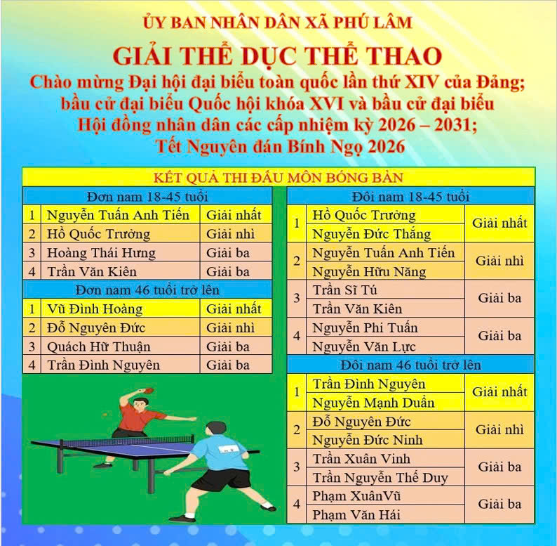 Theo Kế hoạch đã đề ra, việc tổ chức các hoạt động thể dục thể thao trên địa bàn xã nhằm mục tiêu nâng cao sức khỏe thể chất, đời sống tinh thần cho Nhân dân; tạo sân chơi lành mạnh, bổ ích; tăng cường giao lưu, đoàn kết giữa các cơ quan, đơn vị, các ấp và Nhân dân trong xã; đồng thời phát hiện, bồi dưỡng những nhân tố thể thao nòng cốt tham gia các giải đấu cấp trên. Trong đó, môn bóng bàn được lựa chọn tổ chức đầu tiên do phù hợp với điều kiện cơ sở vật chất, dễ thu hút nhiều đối tượng tham gia, góp phần lan tỏa phong trào TDTT rộng khắp. Giải bóng bàn đã thu hút 26 vận động viên tham gia nội dung đơn nam và 16 cặp vận động viên tham gia nội dung đôi nam, đến từ các cơ quan, đơn vị và Nhân dân trên địa bàn xã. Các vận động viên thi đấu ở nhiều nhóm tuổi khác nhau, tạo nên không khí thi đua sôi nổi, hào hứng, thể hiện tinh thần thể thao đoàn kết, trung thực và cao thượng. Trong suốt thời gian diễn ra giải đấu, các trận thi đấu diễn ra nghiêm túc, đúng điều lệ, có chất lượng chuyên môn tương đối đồng đều. Nhiều trận đấu diễn ra gay cấn, hấp dẫn, nhận được sự quan tâm, cổ vũ nhiệt tình của đông đảo khán giả, góp phần tạo không khí vui tươi, phấn khởi trong những ngày đầu năm mới. Kết thúc giải, Ban Tổ chức đã trao giải cho các vận động viên đạt thành tích cao. Kết quả cụ thể như sau: Đối với nội dung đơn nam 18–45 tuổi: Giải Nhất: Nguyễn Tuấn Anh Tiến Giải Nhì: Hồ Quốc Trưởng Giải Ba: Hoàng Thái Hưng, Trần Văn Kiên Đối với nội dung đơn nam 46 tuổi trở lên: Giải Nhất: Vũ Đình Hoàng Giải Nhì: Đỗ Nguyên Đức Giải Ba: Quách Hữu Thuận, Trần Đình Nguyên Đối với nội dung đôi nam 18–45 tuổi: Giải Nhất: Hồ Quốc Trưởng – Nguyễn Đức Thắng Giải Nhì: Nguyễn Tuấn Anh Tiến – Nguyễn Hữu Năng Giải Ba: Trần Sĩ Tú – Trần Văn Kiên; Nguyễn Phi Tuấn – Nguyễn Văn Lực Đối với nội dung đôi nam 46 tuổi trở lên: Giải Nhất: Trần Đình Nguyên – Nguyễn Mạnh Duẩn Giải Nhì: Đỗ Nguyên Đức – Nguyễn Đức Ninh Giải Ba: Trần Xuân Vinh – Trần Nguyễn Thế Duy; Phạm Xuân Vũ – Phạm Văn Hái Việc tổ chức thành công Giải bóng bàn đã góp phần tạo không khí vui tươi, phấn khởi, thúc đẩy phong trào luyện tập thể dục thể thao trong toàn xã, đáp ứng nhu cầu rèn luyện sức khỏe, giao lưu của Nhân dân. Qua đó, từng bước nâng cao chất lượng phong trào TDTT ở cơ sở, tạo tiền đề thuận lợi để UBND xã tiếp tục triển khai hiệu quả các môn thể thao khác theo Kế hoạch trong thời gian tới. Giải đấu là hoạt động thiết thực chào mừng Đại hội đại biểu toàn quốc lần thứ XIV của Đảng; bầu cử đại biểu Quốc hội khóa XVI và bầu cử đại biểu Hội đồng nhân dân các cấp nhiệm kỳ 2026 – 2031; Tết Nguyên đán Bính Ngọ 2026 của UBND xã Phú Lâm; góp phần thực hiện hiệu quả cuộc vận động “Toàn dân rèn luyện thân thể theo gương Bác Hồ vĩ đại”, đồng thời khẳng định sự quan tâm của cấp ủy, chính quyền địa phương đối với công tác chăm lo đời sống văn hóa, tinh thần cho Nhân dân xã Phú Lâm.